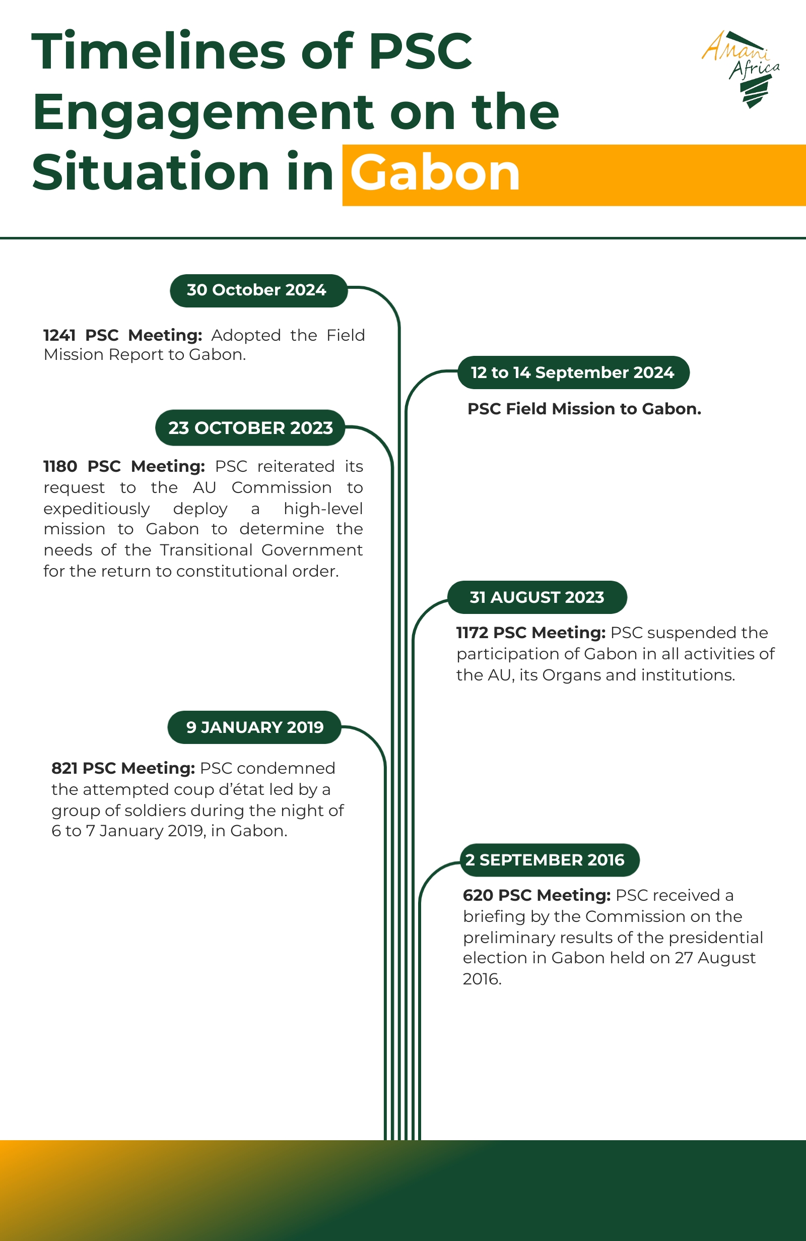 It is to be recalled that following the mission it undertook to Gabon on 12 to 14 September 2024, the PSC held a session for considering the Report of the mission, which sought to legitimise the coup stating that ‘[t]he [Gabonese] interlocutors mentioned that the coup d’état of 30 August 2024, which they described as a ‘Liberation Coup’, was a peaceful coup with no bloodshed.’ The PSC failed to communicate the AU rule on non-eligibility of those who participated in the military seizure of power under Article 25(4) of the African Charter on Democracy, Elections and Governance. Instead, the communique of its 1241st session that considered the report of the field mission requested ‘the AU Commission to engage the Transition Authority of Gabon to identify areas of support and provide the needed technical and financial support to Gabon…’ In addition to this, the Council also requested ‘the Chairperson of the AU Commission to use his good office to engage with the leader of the Transition Authority to mediate the differences with the former President to ensure a smooth and peaceful transition in the country.’