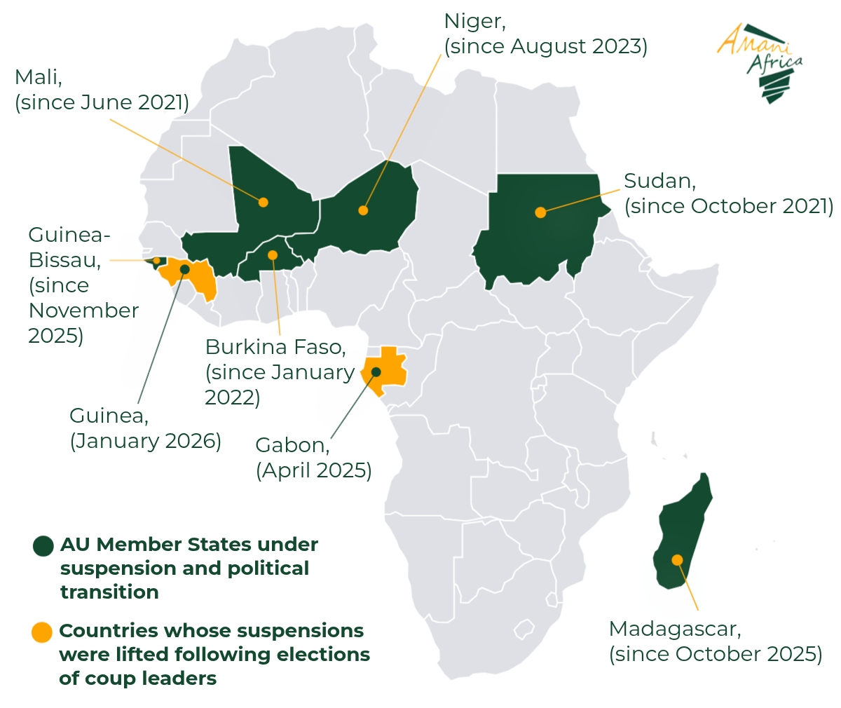 Two notable developments are notable in relation to countries in transition. First, military coups in Guinea-Bissau and Madagascar have kept the number of states under suspension unchanged despite the lifting of the suspension of Gabon. Second was the lifting of Guinea’s suspension from the AU, notwithstanding concerns regarding compliance with Article 25(4) of the African Charter on Democracy, Elections and Governance (ACDEG), which renders perpetrators of UCG ineligible to contest elections organised to restore constitutional order. At its 1325th meeting on 22 January 2026, the PSC determined that the political transition in Guinea had culminated in ‘the successful organisation of the presidential election on 28 December 2025’ and consequently lifted the suspension. Yet, this step did not change the number of states under suspension in 2026 from the number in 2024.
