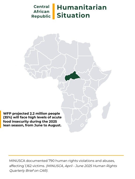 Apart from security dynamics and election deliberations, tomorrow’s meeting is expected to address the dire humanitarian and human rights situation, with civilians, particularly women and children, bearing the brunt of violence and displacement. According to the United Nations Office for the Coordination of Humanitarian Affairs (OCHA) 2025 report, 2.4 million people out of an estimated 6.4 million, representing 38 percent of the population, are considered extremely vulnerable, while one in five Central Africans is either internally displaced or living as a refugee abroad, largely due to conflict, violence, the collapse of essential services and increasingly extreme weather. Armed incursions from Sudan have caused casualties and mass displacement in regions such as Vakaga and Ouham-Fafa, localised flooding in Gbazara has worsened conditions for female-headed households, and the Sudan crisis has driven refugee influxes into northeastern CAR, in some places outnumbering host communities. Additional arrivals of Chadian refugees and CAR returnees in the northwest have intensified pressures, particularly as many areas are cut off during the June to December rainy season. The World Food Programme (WFP) projected that 2.2 million people, or 35 percent of the population, will face acute food insecurity during the 2025 lean season from June to August, while continued militia activity, intercommunal conflict and restricted humanitarian access exacerbate vulnerability, forcing displaced populations into negative coping strategies and exposing women and girls to heightened risks of gender-based violence, poor sanitation and lack of maternal care.